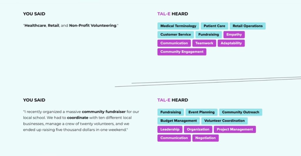 It was built to honor what people already bring to the table. Someone with food service experience can use TAL-E to uncover skills like time management, sanitation, and performing well under pressure, and see how those transfer to healthcare. A single mother working and going to school at the same time can learn to recognize that juggling as a superpower and communicate it to friends, educators, and employers. A veteran can translate their service into workforce language, surfacing strengths like leadership, adaptability, crisis management, and teamwork, and connect those to careers in operations and project management.